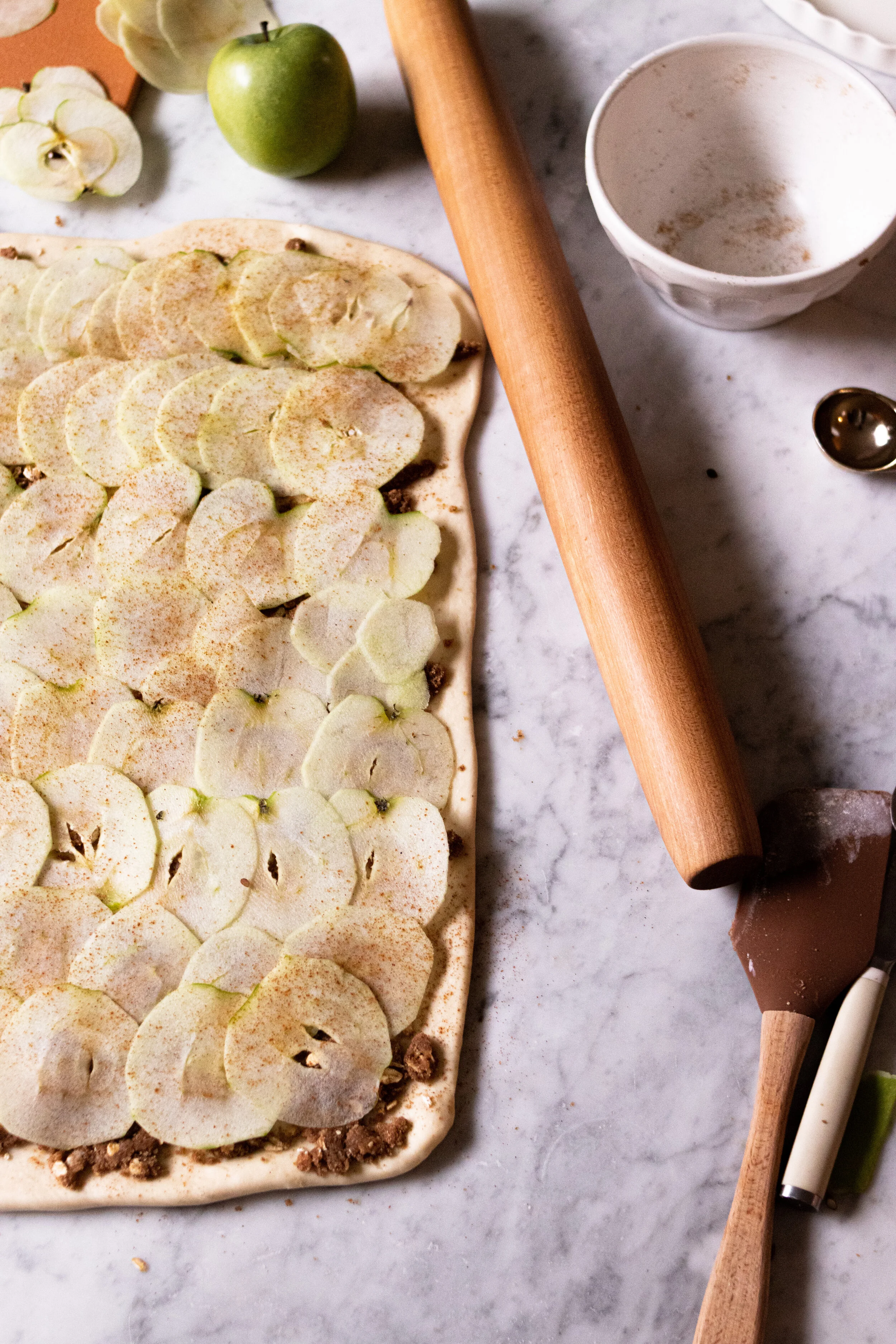 - Spread apples in an even layer on top of the filling, overlapping each about 1.5”. Starting with the long side closest to, roll the dough into a long log and seal the seam. Put into the freezer for about 10 minutes if you have the freezer space.